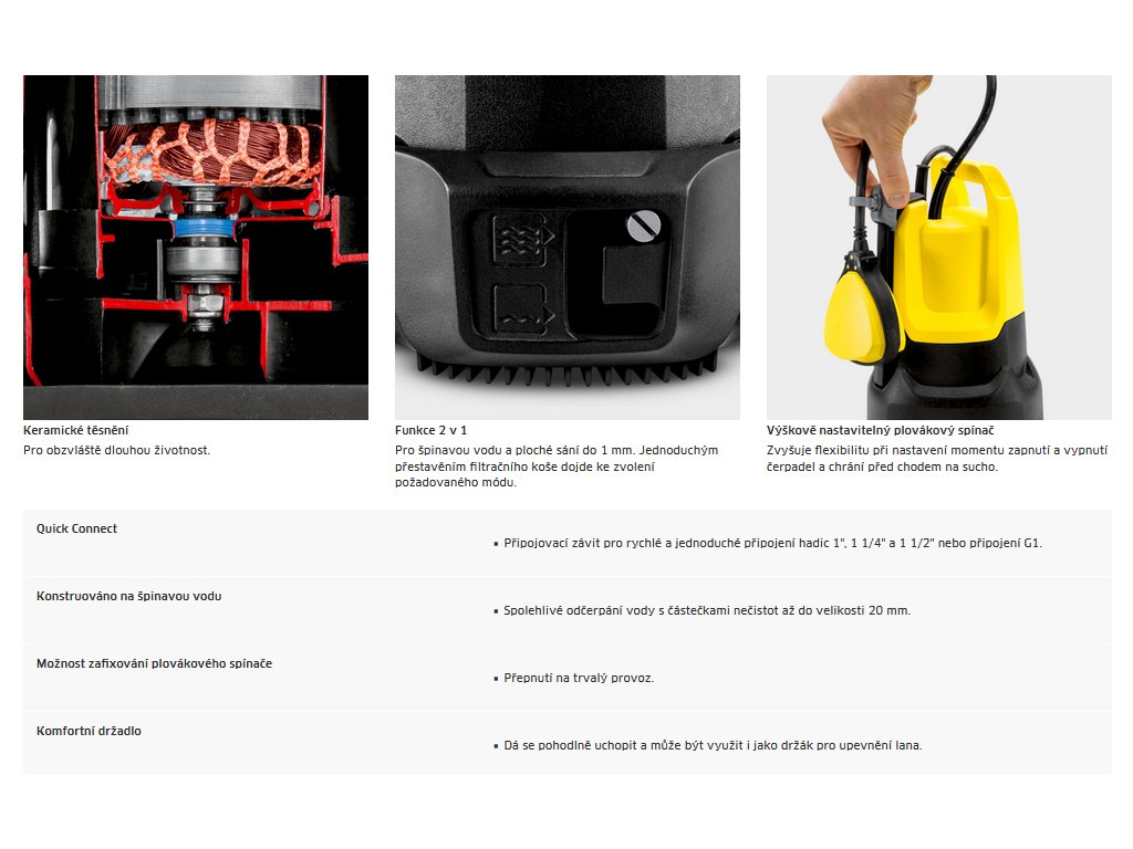 Díky funkci 2 v 1 může být robustní ponorné čerpadlo SP 16.000 Dual použito pro čistou i špinavou vodu a spolehlivě odčerpává špinavou vodu obsahující částice nečistot až do průměru 20 mm. 16 000 l/h je čerpadlo SP 16.000 Dual ideální pro čerpání vody ze zaplavených sklepů, zahradních jezírek a bazénů. kolejnici a může být vertikálně nastaven na čerpání na nízké úrovni. Hadice 1", 1 1/4" a 1 1/2" lze rychle a jednoduše připojit pomocí připojovacích závitů Quick Connect.