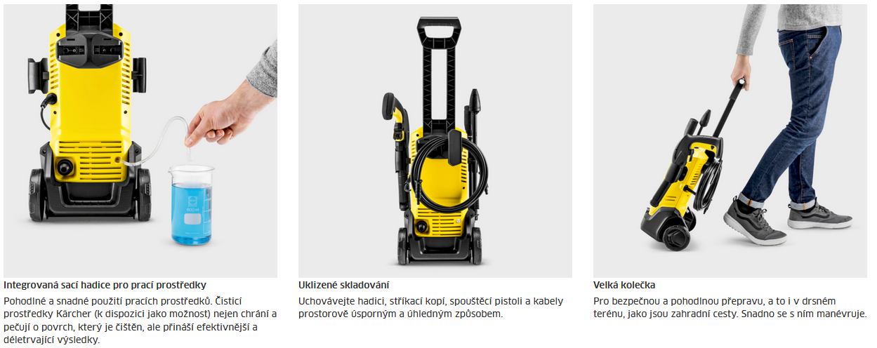 S tlakovou myčkou K 3 je nečistota minulostí. Díky své 6 metrů dlouhé vysokotlaké hadici je pračka ideální pro příležitostné použití v domácnosti a dává třpytivý lesk malým zahradním povrchům a terasám, stejně jako zahradnímu nábytku a automobilům. Díky Vario Power Spray Lance (VPS) lze snadno nastavit tlak vody tak, aby vyhovoval povrchu jednoduchým kroucecím pohybem. Dirt Blaster s rotačním bodem vypouští i ty nejúpornější nečistoty a čerpadlo je chráněno vodním filtrem – po dlouhou životnost. Díky hladce běžícím kolům je tlaková myčka K 3 snadno přepravná všude tam, kde je potřeba.