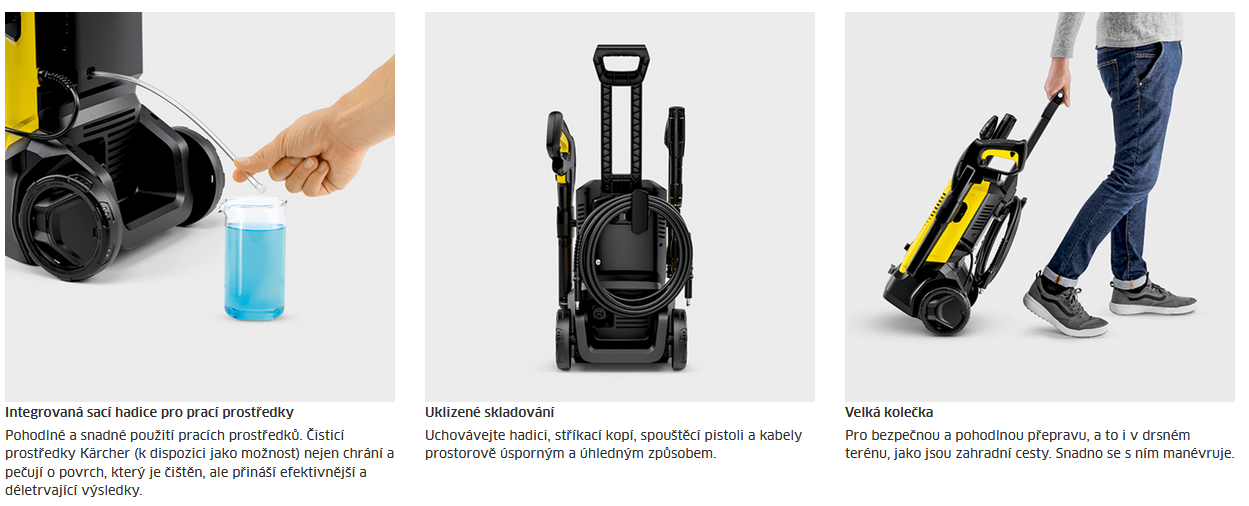 Tlaková myčka K 4 je ideálním společníkem pro pravidelné čištění, které řeší mírné nečistoty, například na vozidlech a středně velkých površích kolem pozemku. Mezi funkce patří spouštěcí pistole, 6metrová vysokotlaká hadice, Vario Power Spray cont (VPS), Dirt Blaster s rotačním bodovým tryskem pro odstranění úporných nečistot a spolehlivý vodní filtr pro ochranu čerpadla proti malým částicím nečistot. Tlak lze snadno nastavit na VPS jednoduše jeho otáčením, což zajišťuje, že čištění je cílené čištění, které je šetrné k povrchům. Dirt Blaster s rotačním bodovým tryskem zaručuje důkladné výsledky čištění i na úporné nečistoty. Veškeré dodané příslušenství lze uložit na samotné zařízení.