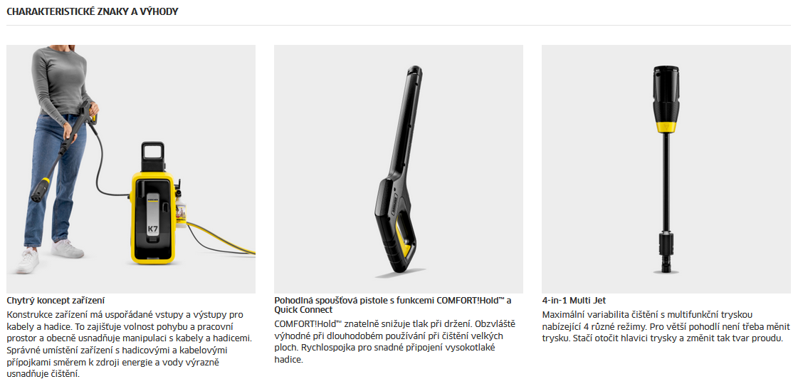 Tlaková myčka K 7 Comfort Premium je ideální pro odstranění silného znečištění z domu a automobilu. Vodou chlazený a tudíž odolný motor je navržen pro časté čištění a zaručuje spolehlivý výkon. Integrovaný naviják hadice s hadicí PremiumFlex nabízí pohodlí a velkou flexibilitu. Kromě toho spoušťová pistole G 180 Q COMFORT!Hold výrazně snižuje tlak potřebný k držení, což umožňuje práci bez únavy, a díky systému Quick Connect lze vysokotlakou hadici připojit rychle a snadno. Inovativní 4v1 multifunkční tryska kombinuje 4 různé rozstřikovací vzory, které lze pohodlně nastavit otočením hlavy trysky. Koncept 2 v 1 pro čisticí prostředky navíc nabízí větší pohodlí a perfektní aplikaci čisticího prostředku podle daného úkolu. Kromě kabelu lze na zařízení snadno uložit také příslušenství a teleskopická rukojeť a kolečka s měkkým povrchem usnadňují přepravu. Pro co nejlepší podporu při používání nabízí aplikace Kärcher Home & Garden integrovaného poradce pro použití a užitečné tipy a triky.