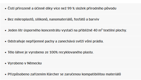 Tento čistič s více než 99 % složek přírodního původu nabízí hloubkové čištění textilních povrchů, jako jsou koberce, čalounění, autosedačky, boty, matrace či záclony. Neobsahuje mikroplasty, silikony, nanomateriály, barviva ani fosfáty, a proto je ideální pro rodiny, alergiky i domácnosti s mazlíčky. Inovativní dvoufázový systém nejprve uvolní nečistoty, které lze poté snadno vysát. Zbylé nečistoty se zapouzdří do krystalků a odstraní během dalšího vysávání po vyschnutí. Čistič je vhodný pro přístroje s extrakčním sprejem a zvládne odolnou špínu, mastnotu, skvrny od jídla či nápojů i zbytky kosmetiky. Navíc odstraňuje pachy, dodává textiliím svěží vůni a lze jej použít i jako odstraňovač skvrn.