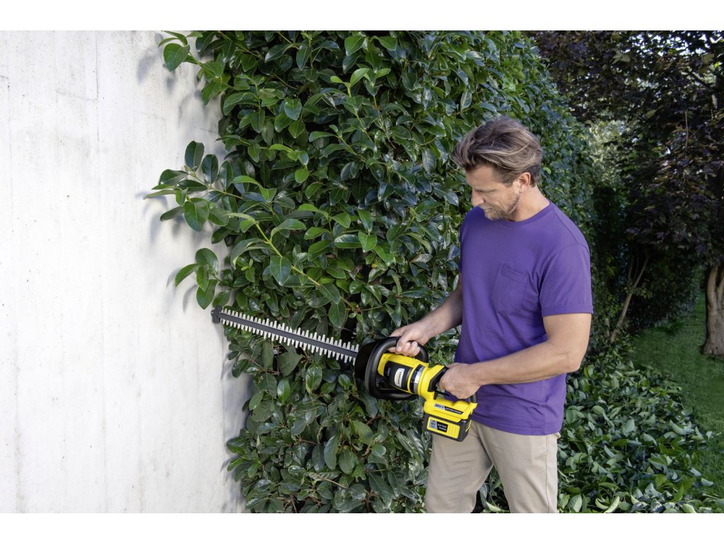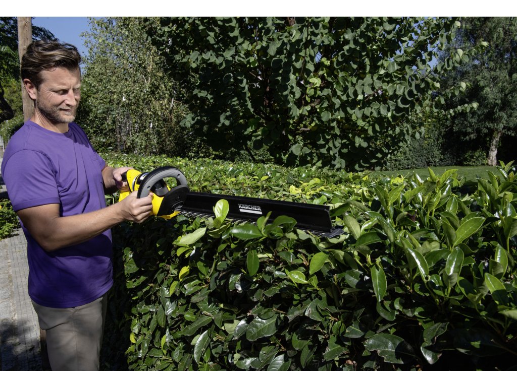 Síla pro dokonalý střih - 36V akumulátorové nůžky na živý plot HGE 36-60 od Kärcher. Díky dvoustupňové regulaci otáček je možné volit mezi maximálními otáčkami a maximální silou podle použití. Kromě toho lze pomocí funkce řezání bez námahy řezat i silnější větve. Další výhodou je rukojeť otočná o 180°, která zabraňuje únavě ramen nebo ramenního kloubu. Lišta je také praktická, takže ustřižené větve padají přímo na zem, a ne do živého plotu. Laserem řezané a diamantem broušené ostří nůžek na živý plot zaručuje vždy přesný výsledek střihu. Dodatečná ochrana hrotu nože zabraňuje poškození budov a podlah i poškození samotného nože. Závěsné oko, které je integrované v ochraně hrotu nože, umožňuje úsporné zavěšení na zeď. Nůžky na živé ploty jsou také vybaveny systémem proti zablokování pro nepřerušovanou práci.Doplňkové parametry