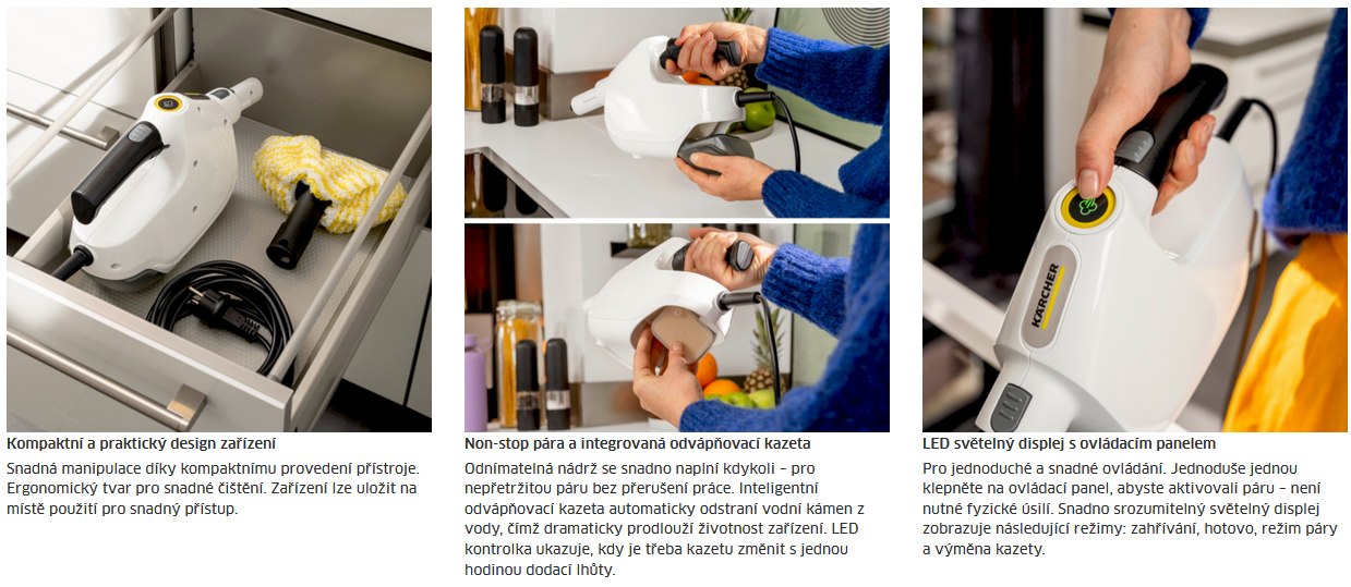 Kompaktní ruční parní čistič SC 1 Multi čistí bez chemikálií a je připraven k hloubkovému čištění v blesku. Důkladné čištění odstraňuje z tvrdých povrchů až 99,999% virů1) a 99,99 % všech běžných bakterií v domácnosti2). Kompaktní a praktický design zařízení umožňuje pohodlné používání a snadné skladování v nejmenších prostorech. SC 1 Multi je připraven k použití za 30 sekund a snadno se doplňuje díky vyjímatelné nádrži na vodu – pro delší intervaly údržby a méně přerušení. Vyměnitelná odvápňovací kazeta zajišťuje automatické odvápnění po dobu životnosti výrobku, která je pětkrát delší. LED světelný displej s ovládacím panelem umožňuje jednoduché a snadné ovládání. Různé režimy, jako je zahřívání, ready-to-use, režim páry a výměna kazet, jsou vždy vystaveny. K dispozici je také možnost rozšíření na inovativní multifunkční parní mop 4 v 1.
