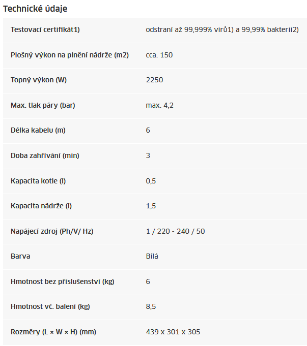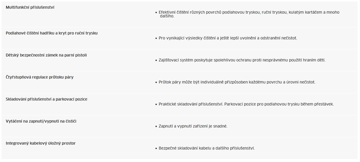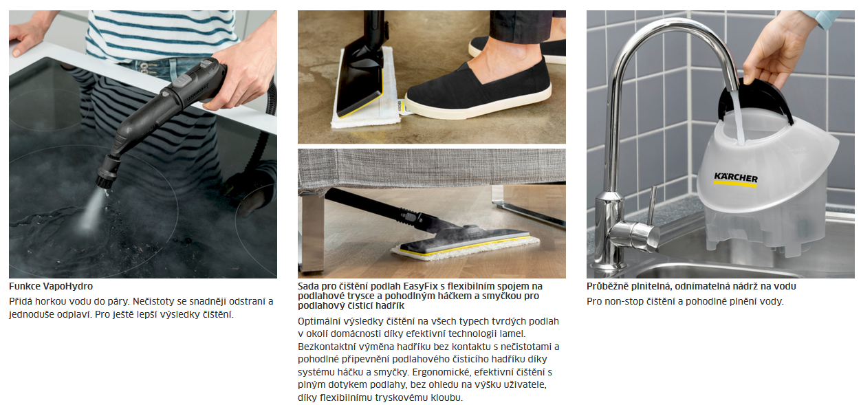 Čištění a žehlení? Plná pára vpřed! Žádný problém pro Kärcher SC 5 EasyFix. Je to proto, že nejvýkonnější parní čistič ve své třídě (4,2 barový tlak páry) je také dodáván s možností připojení pro tlakovou žehličku na páru. Důkladné čištění pomocí parního čističe Kärcher odstraňuje 99,999% virů1) a 99,99% všech běžných domácích bakterií2) z typických tvrdých povrchů pro domácnost. Řada příslušenství dostane dlaždice, varné desky, výfukové digestoře a dokonce i ty nejmenší štěrbiny bez poskvrny čisté, ať už lehce špinavé nebo zakořeněné s tvrdohlavými nečistotami. Podlahová tryska EasyFix s flexibilním spojem umožňuje ergonomickou práci. A technologie lamella zaručuje perfektní výsledky čištění. Podlahový čisticí hadřík lze snadno připevnit k podlahové trysce a znovu jej odstranit, aniž byste museli přijít do styku s nečistotami. Funkce VapoHydro odstraňuje tvrdohlavé nečistoty ještě snadněji přidáním horké vody. Intenzitu páry lze nastavit na povrch a nečistoty. Vyjímatelnou nádržku na vodu lze trvale doplnit – pro nepřerušované čištění. Další doplňky: integrovaný kabelový úložný prostor, úložný prostor příslušenství, parkovací pozice pro podlahovou hubici.