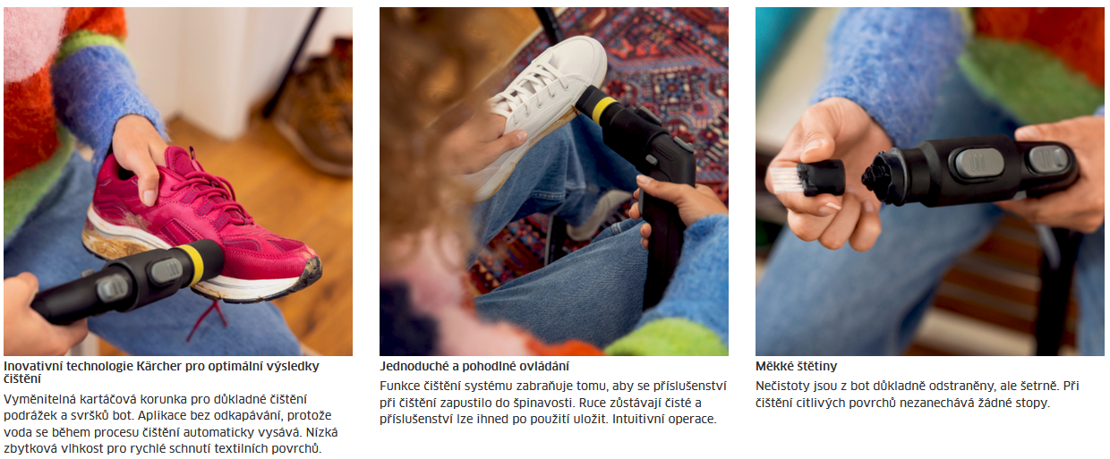 Inovativní Kärcherova bota! čistič čistí různé druhy sportovní obuvi a ležérní obuv rychle, důkladně a bez zanechání jakýchkoli kapaček. To usnadňuje čištění běžecké obuvi, vycházkových bot nebo dokonce módních trenérů, například uvnitř domu, aniž byste udělali nepořádek uvnitř. Díky vyměnitelným korunkám štětce lze podrážku i svršek obuvi rychle a důkladně vyčistit. Měkké štětiny umožňují účinné a šetrné čištění, a to i z jemnějších materiálů. Díky automatickému vysávání vody při čištění boty vysychají v žádném okamžiku. Ta Bota! Čistič také zaujme funkcí čištění systému, která zabraňuje tomu, aby se příslušenství při čištění zaneřádilo. Ta Bota! Čistič je proto ideálním spolehlivým doplňkem pro čištění rozprašovačů SE 3 Compact, SE 4, SE 5 a SE 6 pro všechny úkoly čištění bot.