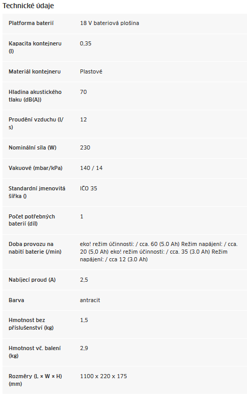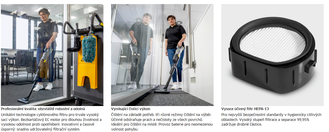 Robustní suchý vysavač LVS 1/1 Bp na baterie nabízí vynikající sací výkon a účinně odstraňuje prach a nečistoty. Technologie cyklónového filtru Kärcher udržuje sací výkon trvale vysoký. Akumulátorový, kompaktní a manévrovatelný vysavač je ideální pro čištění na místě v hotelovém, stravovacím, maloobchodním a stavebním úklidu. Díky své neomezené volnosti pohybu je ideální i pro čištění schodů. Integrovaný filtr HEPA 13 zajišťuje nejvyšší hygienické standardy. Sací výkon lze nastavit ve třech fázích a v několika jednoduchých krocích se vysavač válců stává ručním vysavačem pro čalounění a různé další povrchy. Odpadková nádoba nevyžaduje žádné filtrační sáčky, šetří náklady a je udržitelná. Může být rychle a hygienicky vyprázdněn – aniž by se dostal do přímého kontaktu s nečistotami. S výkonnými 18voltovými dobíjecími bateriemi Kärcher dosahuje vysavač vynikajících výsledků čištění. Praktický držák zajišťuje, že dodaná štěrbinová tryska je vždy připravena k ruce. Poznámka: baterie a rychlonabíječka nejsou součástí dodávky a musí být objednány samostatně. Velký výběr trysek a příslušenství (DN 35) lze objednat jako volitelné doplňky.