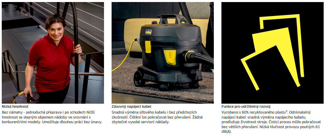 Limitovaná edice černého vysavače T 11/1 Classic Adv Go!Further, vyrobeného z 60 % recyklovaného plastu¹⁾, je dodáván s exkluzivním příslušenstvím, a to 10 vliesovými filtračními sáčky. Vysavač zaujme prvotřídním sacím výkonem, vysokou odolností a atraktivním poměrem cena/výkon. Díky 60% obsahu recyklovaného materiálu¹⁾ se od samého začátku šetří zdroje a snižuje se spotřeba energie. Navzdory svému silnému sacímu výkonu zůstává stroj příjemně tichý, pouze 61 dB(A), takže jej lze používat i v místech citlivých na hluk. Kompaktní a stabilní vysavač má objem nádoby 11 litrů a váží pouze 4 kilogramy. Ergonomická rukojeť a integrované koleno umožňují dlouhou práci bez únavy a pohodlnou přepravu. 12 metrů dlouhý napájecí kabel s konektorem může uživatel kdykoli snadno vyměnit. Na samotném vysavači je speciální úložný prostor pro příslušenství, jako je sací trubice a podlahová hubice.